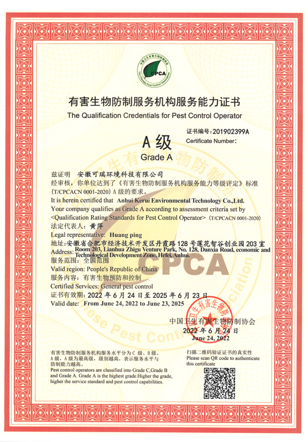凱瑞蟲控是安徽可瑞環(huán)境科技有限公司旗下品牌,安徽可瑞環(huán)境科技有限公司成立于2014年,注冊資金500萬元,全國A級資質,致力于蟲害風險管理并提供蟲害消殺、防疫消毒、有害生物防制、蟲害控制管理與監(jiān)測、衛(wèi)生防疫消毒、商業(yè)清洗清潔服務、空氣治理服務、環(huán)境綠化施工與養(yǎng)護、藥品和器械銷售、技術咨詢與培訓等業(yè)務的服務性公司。公司是一家有行業(yè)資質、注冊商標及專利的公司。我們不參與各種擾亂市場秩序的低價競爭,堅持以合理的價格、新穎的設備、優(yōu)質的技術、完善的質保體系和質保措施,來對客戶進行綜合的服務工作。公司本著...